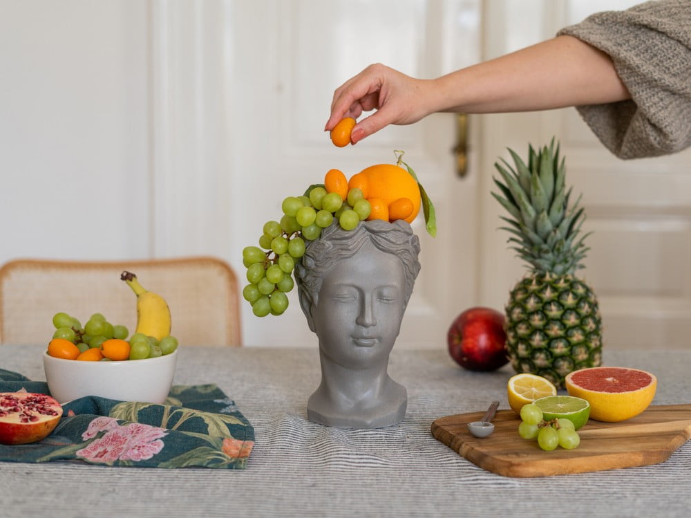 Naudokite vazoną kaip vaisių dubenį terasoje. Išdėliokite vynuogių, persikų, abrikosų, granatų ir tropinių vaisių, pavyzdžiui, apelsinų ir citrinų.