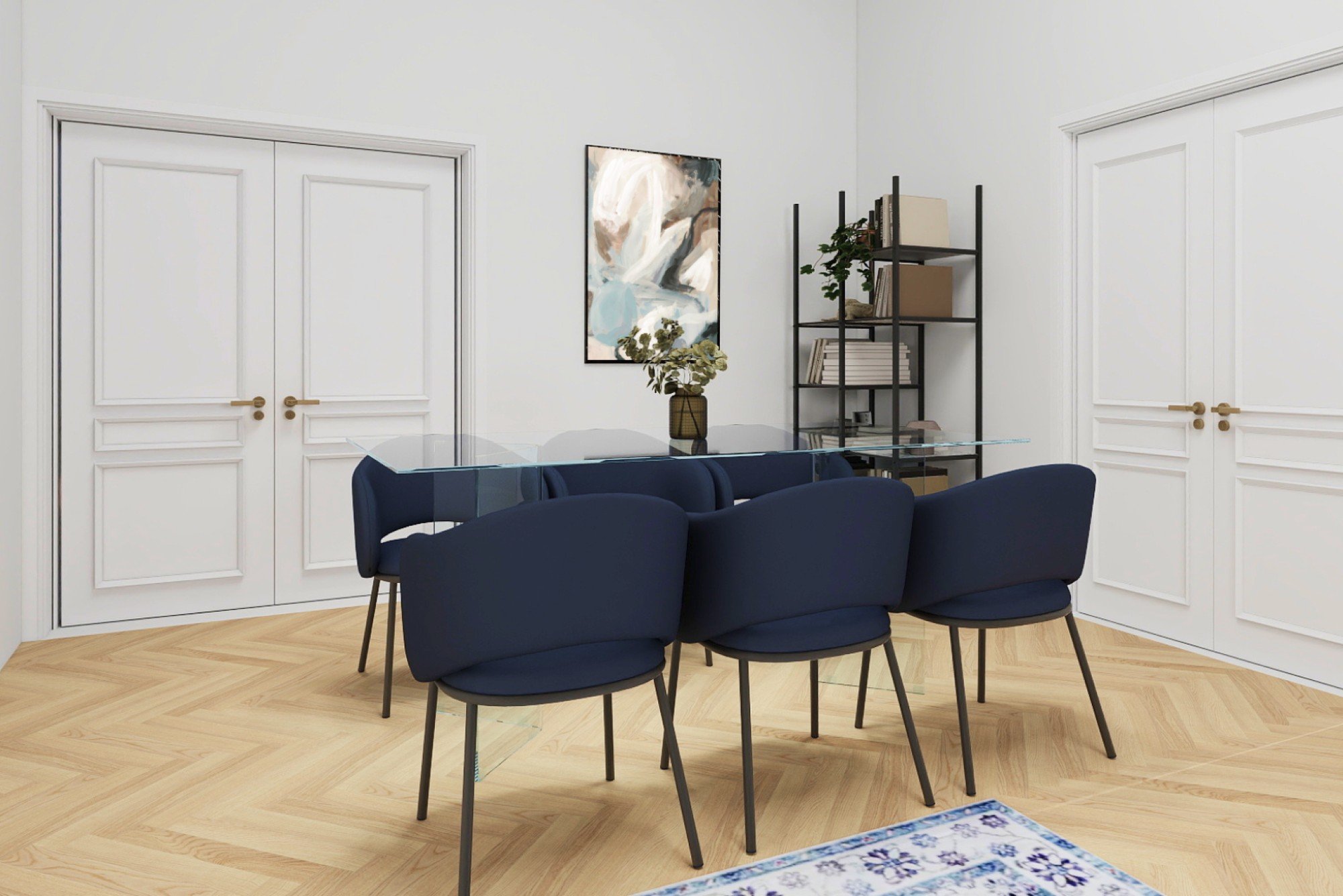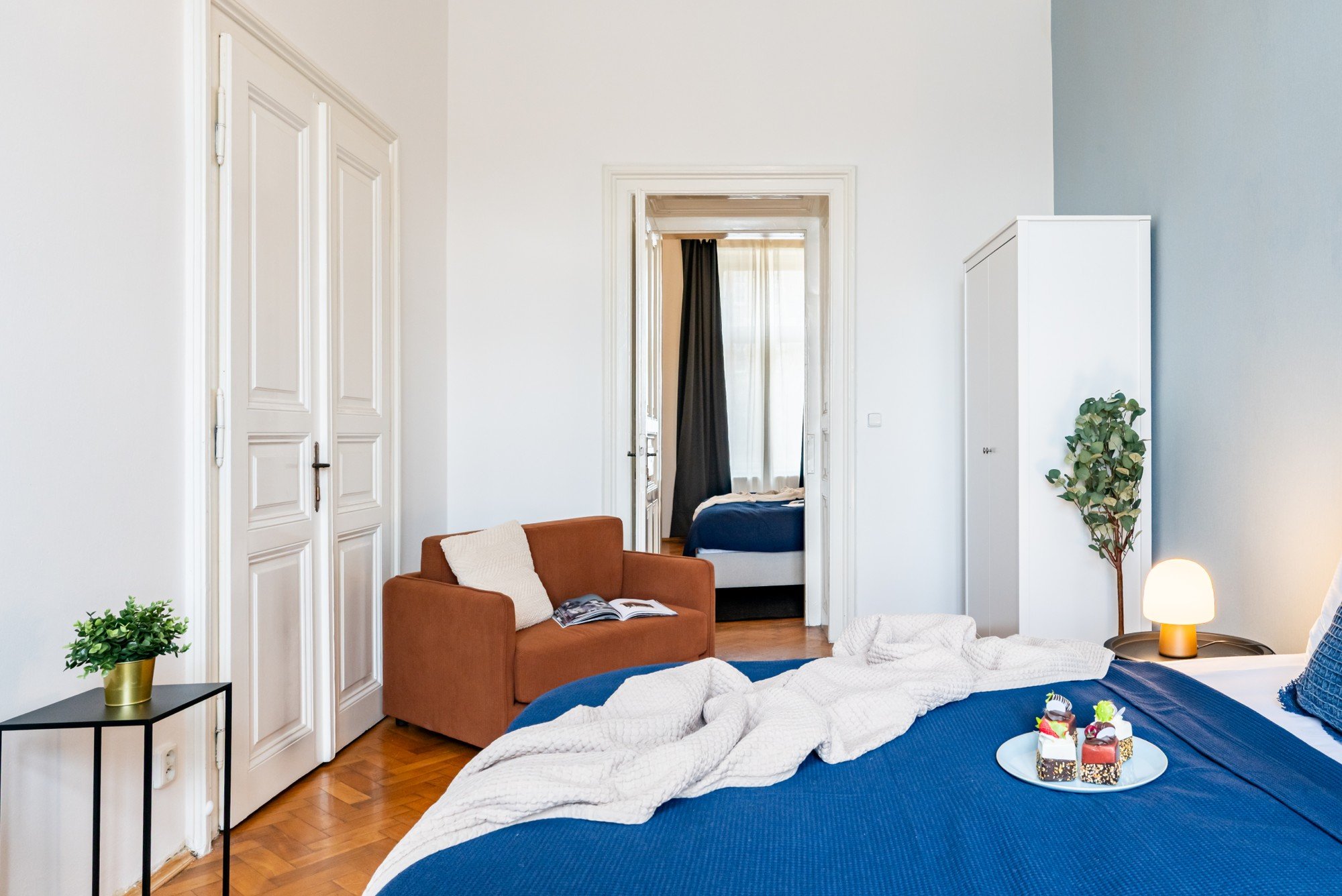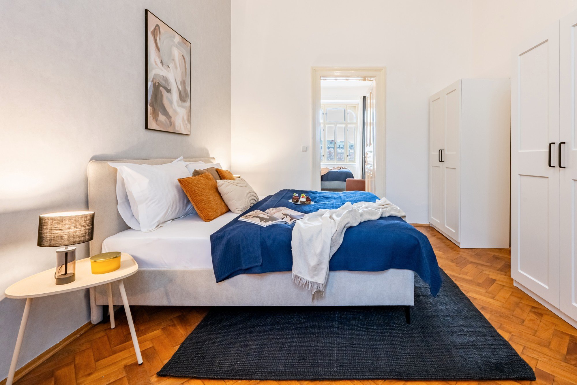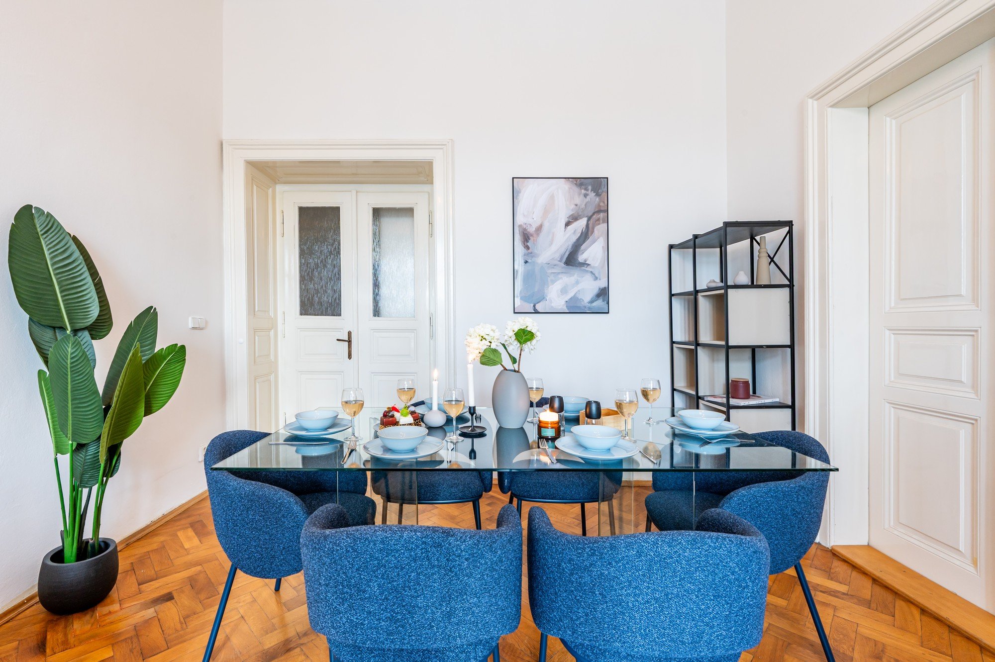 Erdvus butas istoriniame name derina dosnias proporcijas su apgalvotomis detalėmis. Aukštos lubos, originalios parketo grindys ir tamsios medienos bei švelnių mėlynos spalvos atspalvių kontrastas sukuria nesenstantį interjerą, kuris yra ramus, elegantiškas ir natūraliai jaukus. Kasdieniam gyvenimui ir bendravimui pritaikytas išplanavimas įrodo, kad komfortas ir charakteris gali būti neatsiejami.