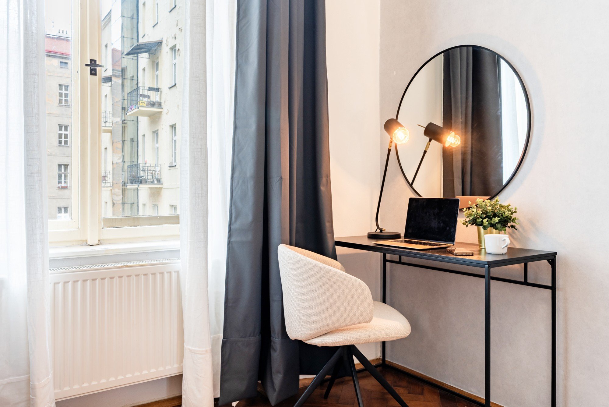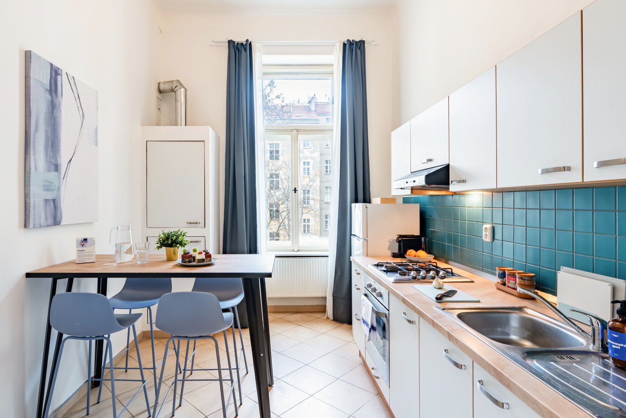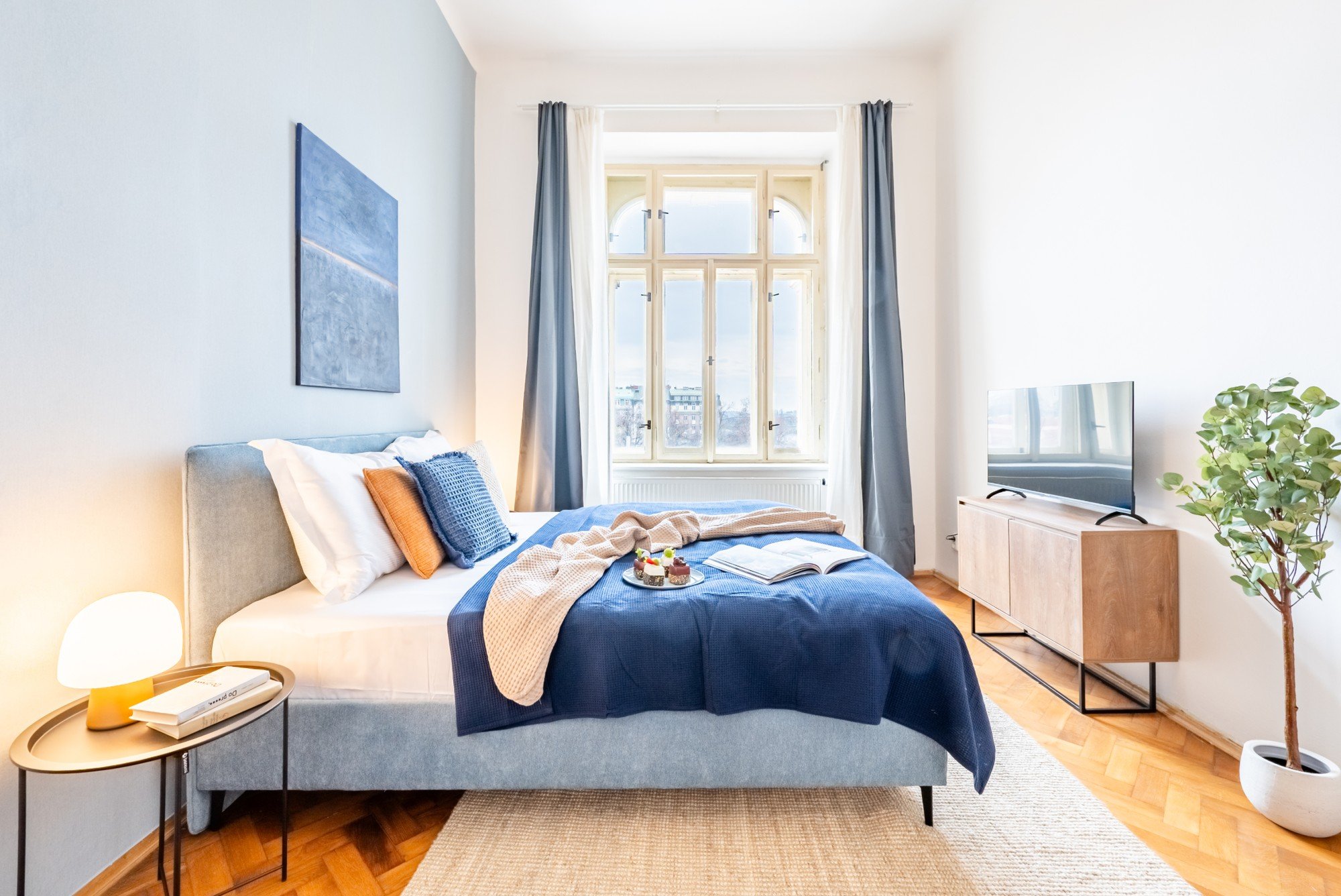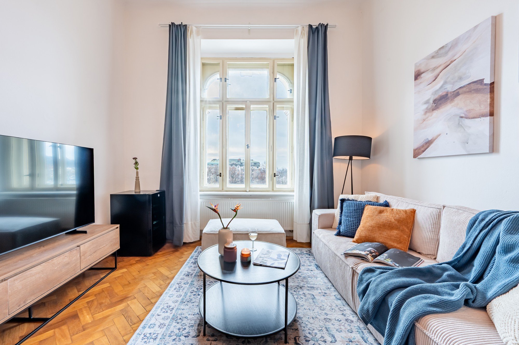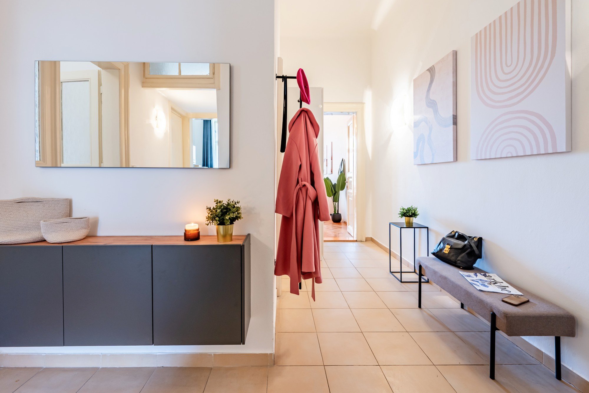 Erdvus butas istoriniame name derina dosnias proporcijas su apgalvotomis detalėmis. Aukštos lubos, originalios parketo grindys ir tamsios medienos bei švelnių mėlynos spalvos atspalvių kontrastas sukuria nesenstantį interjerą, kuris yra ramus, elegantiškas ir natūraliai jaukus. Kasdieniam gyvenimui ir bendravimui pritaikytas išplanavimas įrodo, kad komfortas ir charakteris gali būti neatsiejami.