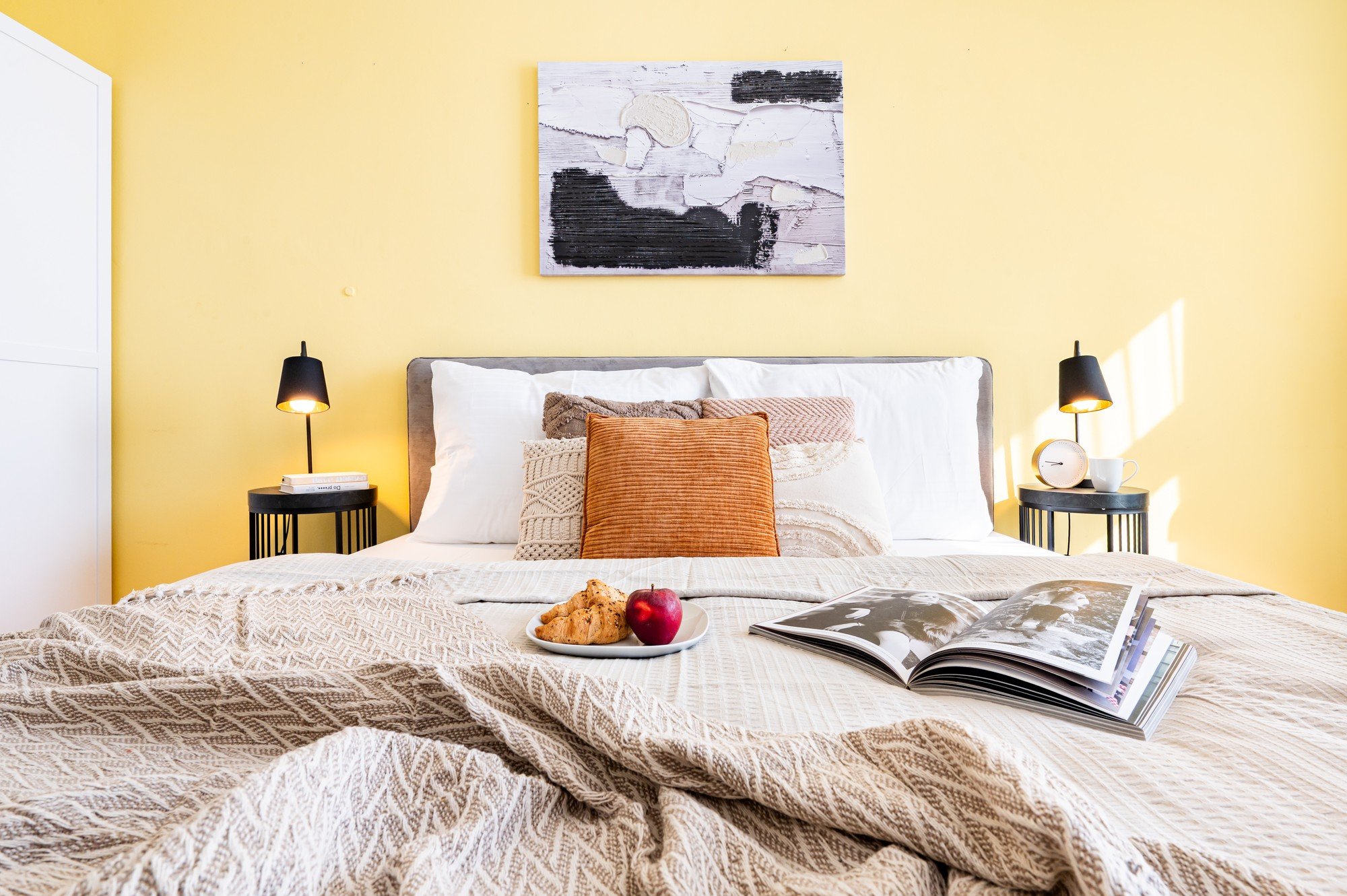 Erdvė yra gaivi, optimistiška ir harmoninga, su šiltais geltonais akcentais, sluoksniuota tekstile ir detalėmis, kurios miegamąjį paverčia jaukia, bet modernia vieta atsipalaiduoti.