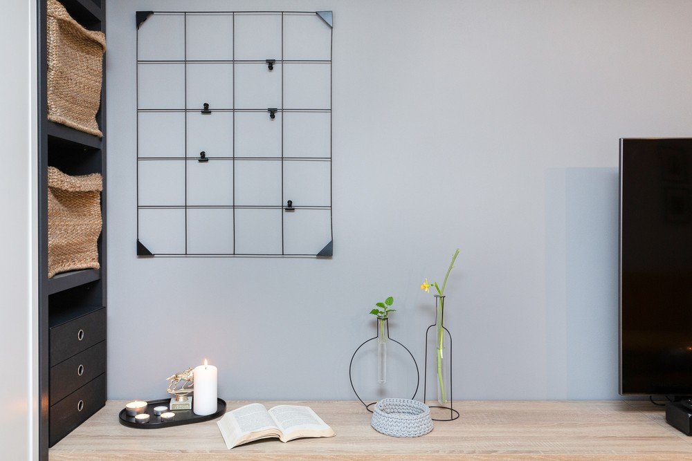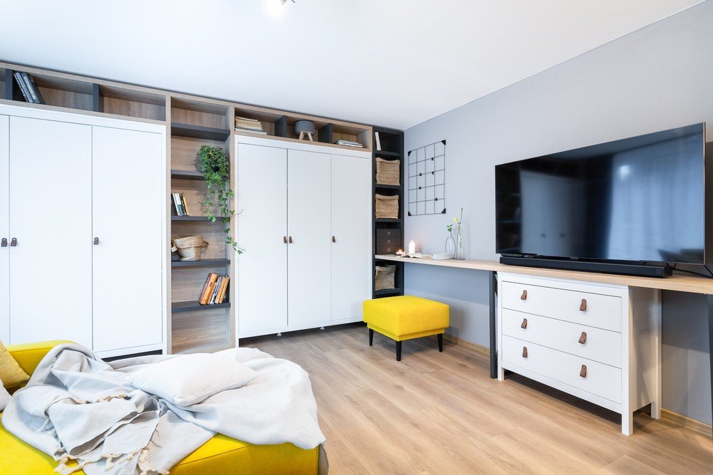 Kad interjeras neatrodytų nuobodus, jie jį atnaujino ryškiai geltona sofa, kurią galima lengvai transformuoti į patogią dvigulę lovą. Patogumui užtikrinti, dizaineriai pasirinko minimalistinį juodų kavos staliukų rinkinį.