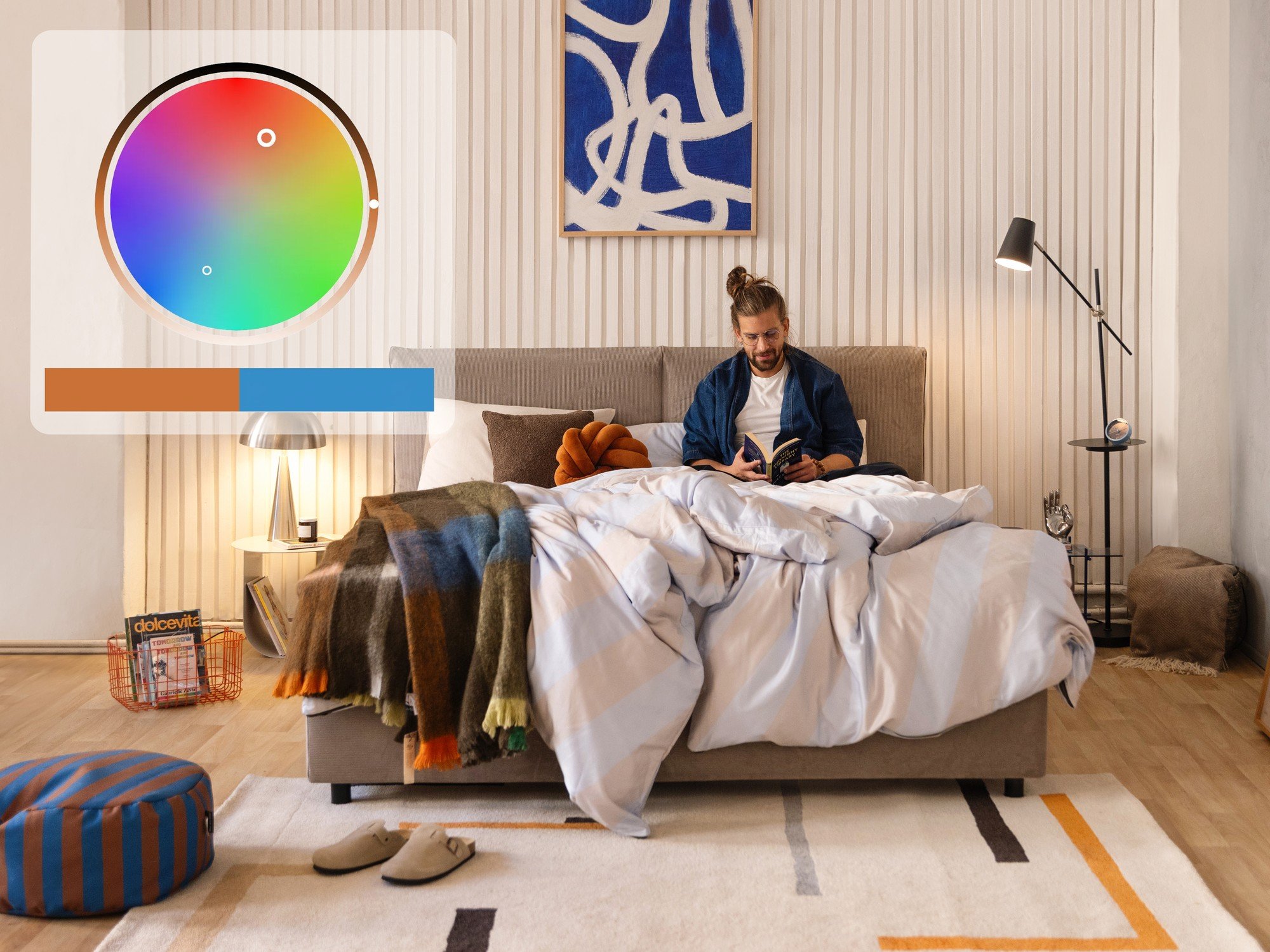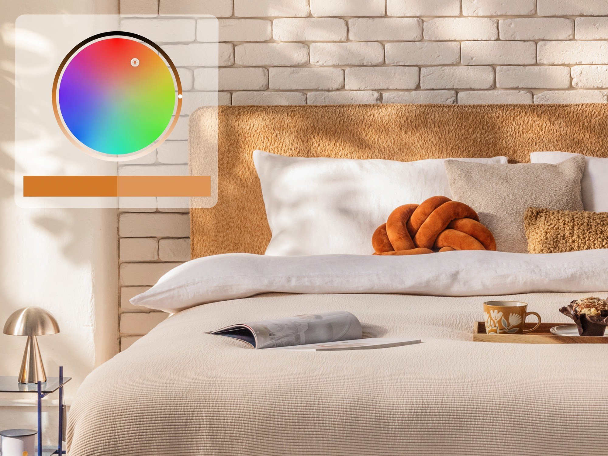 Pridėkite spalvingą lempą, šviežias gėles ir skirtingų tekstūrų pagalvėles.