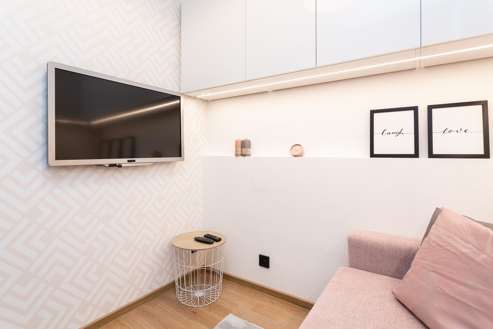 Televizorių jie pakabino ant trumpesnės sienos, o kampe pridėjo staliuką daiktams laikyti.