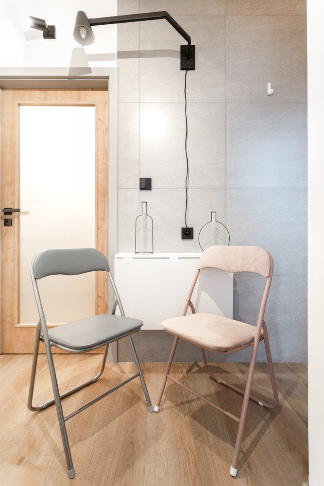 Todėl sėdimųjų vietų klausimas buvo išspręstas naudojant sulankstomą stalą ir subtilias sulankstomas kėdes, kurias buvo galima pakabinti ant pilkų plytelių sienos. Tai apsaugojo jį nuo purvo, be to, interjerui suteikė griežto minimalizmo dozę.