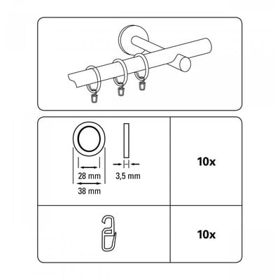 Šis "Gardinia" 10 dalių žiedų ir kabliukų rinkinys yra idealus priedas, ypač prie "Elba" kolekcijos išskleidžiamų uždangalų, pavyzdžiui, ilgio 120 - 210 cm arba 190 - 340 cm. Dėl aukštos kokybės jis patikimai išlaikys užuolaidas ir draperijas kabančias, todėl galėsite mėgautis papildomu privatumu savo namuose ir kartu jaustis jaukiai.