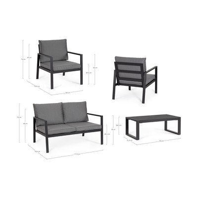 Sofos matmenys – 117,5 x 73,5 x 76 cm, sėdimosios dalies aukštis – 39,5 cm, porankių aukštis – 55 cm. Kiekvieno iš fotelių matmenys yra 63 x 73,5 x 76 cm, sėdimosios dalies aukštis 39,5 cm, o porankio aukštis 55 cm. Komplektą papildo stalas su grotelėmis, kurio matmenys 92 x 51,5 x 34,5 cm. Visas komplektas pagamintas iš aliuminio, kuris užtikrina jo lengvumą ir patvarumą.