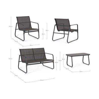 Bizzotto sodo poilsio baldų komplektas Gonzalo. Rinkinį sudaro du krėslai, dvietė sofa ir kavos staliukas, kurie sukuria idealią erdvę keturiems atsipalaiduoti.