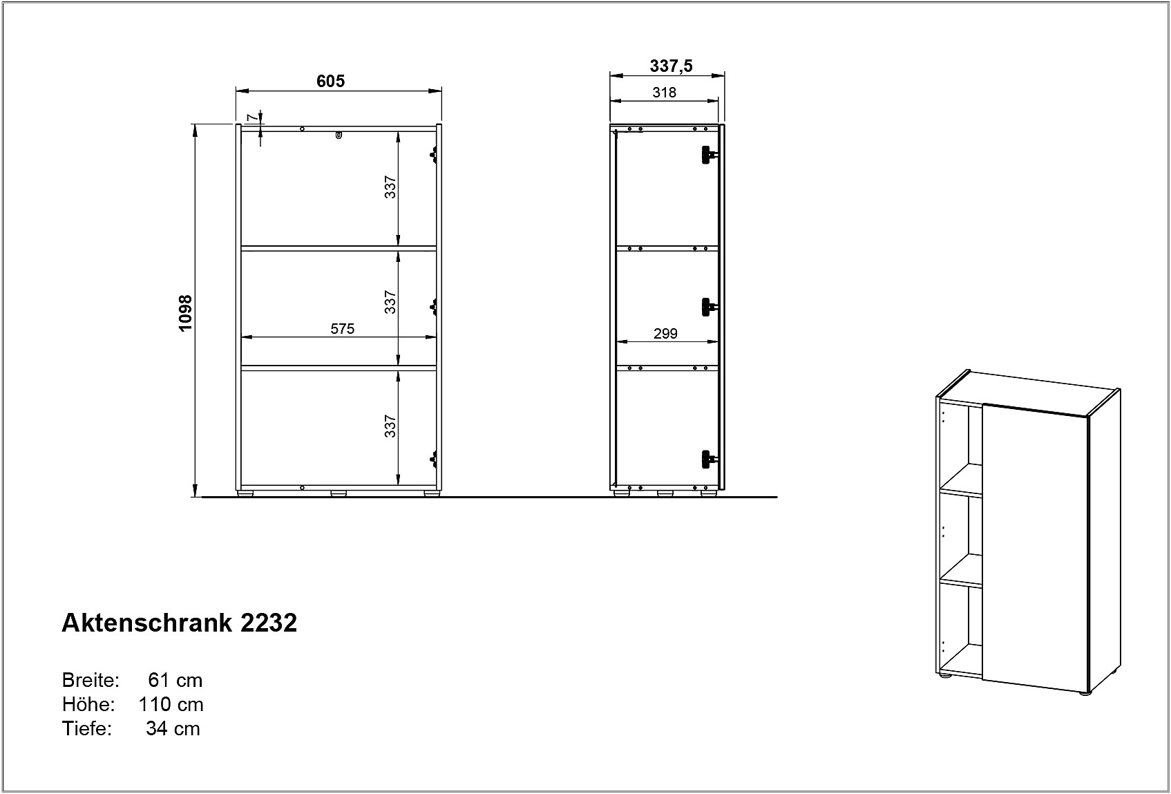 "Germania" knygų spinta "Adrano" yra stilingas ir praktiškas jūsų namų priedas. Knygų spinta turi vienas dureles, už kurių yra dvi stacionarios lentynos. Jos padalija erdvę į tris dalis. Durelės uždengia tik 2/3 knygų spintos, todėl susidaro trys atviri skyriai. Viršutinės nuleistos lentynos keliamoji galia - iki 10 kg, apatinės - iki 25 kg. Knygų spinta tiekiama su penkiais juodais plastikiniais bėgliukais.