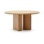 Kave Home apvalus valgomojo stalas Nealy. Jo dizainas išsiskiria ąžuolo medienos apdaila ir originaliu pagrindu, kuriame susilieja apvalios bei kampuotos formos.