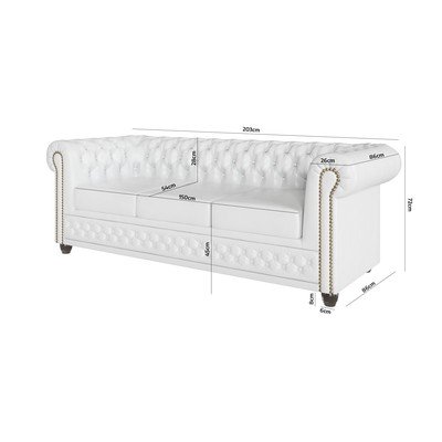 Iš dirbtinės odosMiegojimui/sulankstomaChesterfield tipoAtsparus vandeniui/tinka augintiniams/atsparus dėmėmsBaltos spalvosDvivietėPlotis 203 cmGylis 86 cmSėdynės gylis 54 cm