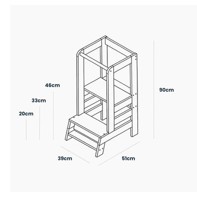 Tvirta medinė bokštelio konstrukcija sukurta taip, kad užtikrintų maksimalų saugumą ir skatintų vaikų savarankiškumą. Platformą be įrankių galima lengvai reguliuoti iki trijų skirtingų aukščių - 20 cm, 33 cm ir 46 cm nuo grindų.