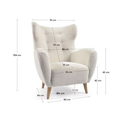 Krėslas aptrauktas buklė audiniu, kuris suteikia jam malonią tekstūrą. Stabilumą užtikrina tvirtos buko medienos kojos.