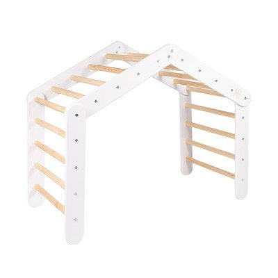 Montessori agurkų trikampis iš "Meowbaby". Jo modulinė konstrukcija leidžia statyti vieną didelį namelį arba dvi mažesnes kopėčias, kad būtų galima žaisti įvairiai.