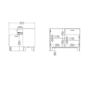Komodoje, kurios matmenys 99x73x39 cm, yra daug vietos trijuose uždaruose skyriuose ir viename stalčiuje. Baltos spalvos durelės ir stalčiai kontrastuoja su natūralaus ąžuolo spalvos rėmo apdaila ir nuožulniomis kojelėmis, todėl atrodo stilingai. Medinės rankenos puikiai dera prie bendro dizaino.