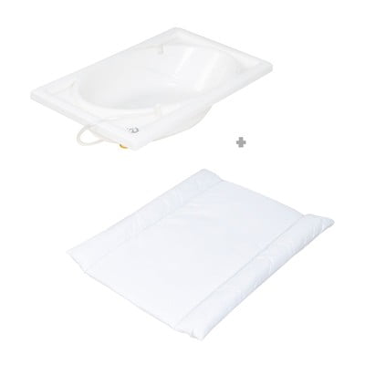Į komplektą įeina minkštai paminkštintas pervystymo kilimėlis (43 x 78 cm) su saugiais kraštais ir plaunamu PU paviršiumi, švelniu kūdikio odai. Vonelėje galima patogiai maudyti, o po to kūdikį iš karto perkelti ant pervystymo paviršiaus. Vandenį galima lengvai išpilti naudojant praktišką išleidimo žarną ir nereikia nešti vonelės. Pervystymo stalas taip pat turi du medžiaginius skyrius, kuriuose yra pakankamai vietos sauskelnėms, kosmetikai ir kitiems būtiniausiems daiktams laikyti.