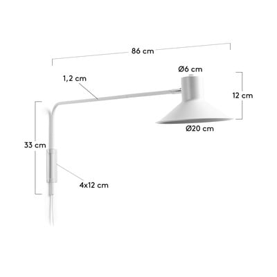 Kave Home sieninis šviestuvas Aria pagamintas iš baltai lakuoto plieno. Jis turi lanksčią jungtį, kuri leidžia lengvai nukreipti šviesą ten, kur reikia. j Šviestuvas suderinamas su E14 lemputėmis, kurių maksimali galia 25 W. Lemputė į komplektą neįeina.