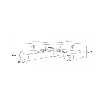 Iš šenilinio audinioSu dešiniuoju kampu/su kairiuoju kampu/kintama/„L“ formosGarstyčių spalvosKeturvietėPlotis 271 cmGylis 300 cmSėdynės gylis 62 cm