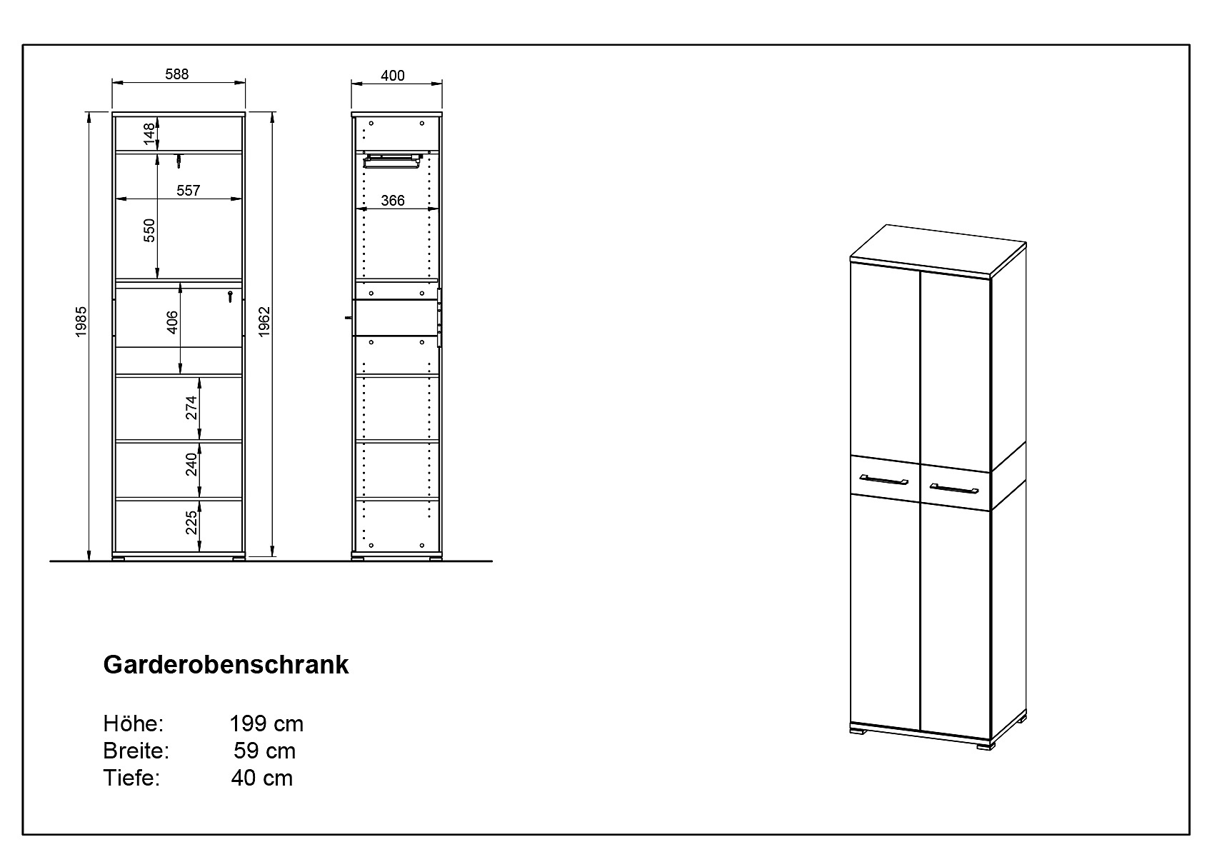 Drabužių spinta TopixIš ąžuolo, iš medžio drožlių plokštės, paviršiaus apdaila: Melaminas, su matiniu paviršiumi, baltos spalvos/natūralios spalvos, plotis 59 cm, aukštis 199 cm, gylis 40 cm