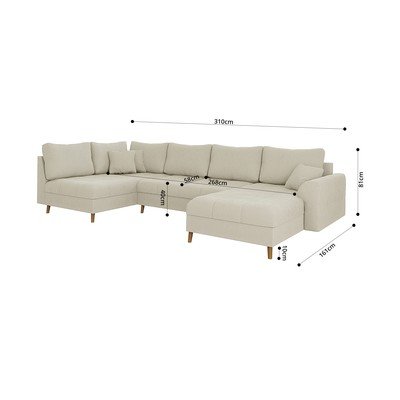 Iš kordinio velveto, su dešiniuoju kampu/„U“ formos, smėlio spalvos, kito dydžio, plotis 310 cm, gylis 161 cm, sėdynės gylis 58 cm