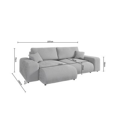 Kampinė sofa JustinIš kordinio velveto, su dešiniuoju kampu/su kairiuoju kampu/kintama/su gultu, šviesiai pilkos spalvos, trivietė, plotis 237 cm, gylis 144 cm, sėdynės gylis 73 cm