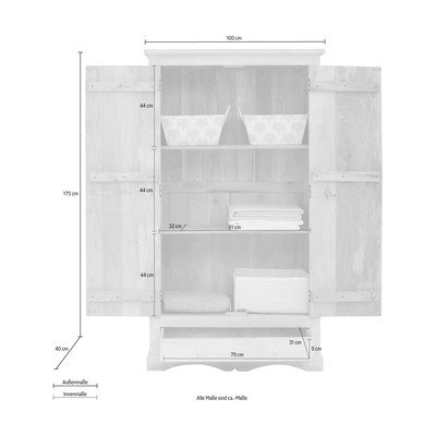 Iš mango masyvo, paviršiaus apdaila: lakuotas, baltos spalvos, plotis 100 cm, aukštis 175 cm, gylis 40 cm
