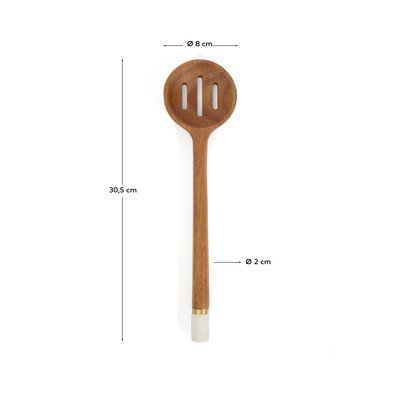 Šis funkcionalus ir dekoratyvus medinis šaukštas su trimis išilginėmis skylėmis yra idealus pagalbininkas jūsų virtuvėje. Jo rankena apdailinta metaliniu žiedu ir galiuku, pagamintu iš kitos medžiagos, kuri suteikia jam elegantiškos išvaizdos.