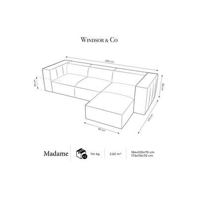Kampinė sofa MadameIš odos, su dešiniuoju kampu/su gultu, atsparus vandeniui, tamsiai mėlynos spalvos, keturvietė, plotis 290 cm, gylis 173 cm, sėdynės gylis 60 cm