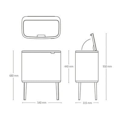 Kompaktiškas dizainas užtikrina, kad šiukšliadėžė tilptų mažesnėse erdvėse, pavyzdžiui, prie pat sienos ar kampe. Užfiksuotos kojelės su reguliuojama neslystančia apačia taip pat pakelia ją į viršų, todėl veiksmingai tausoja nugarą ir palengvina valymą po ja.