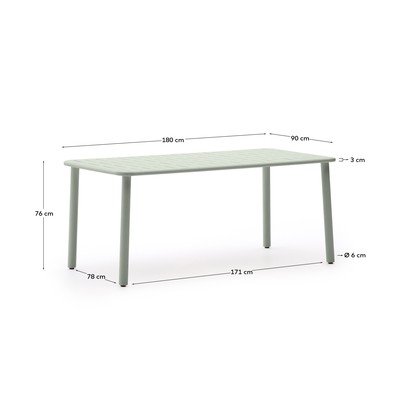 Kave Home sodo valgomojo stalas Brai. Dėl patvaraus cinkuoto plieno jis atsparus dilimui ir korozijai, todėl puikiai tinka naudoti tiek viduje, tiek lauke.