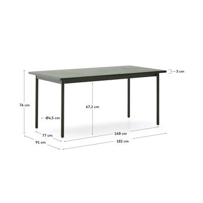 Kave Home valgomojo stalas Maurina. Jis išsiskiria stalviršiu su rankomis klotų plytelių mozaika, o dėl patvarios konstrukcijos idealiai tinka naudoti tiek viduje, tiek lauke.