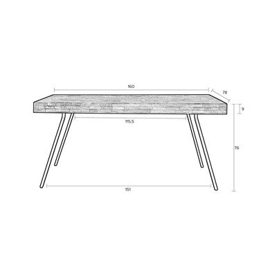 "White Label" valgomojo stalo viršus yra iš perdirbto tikmedžio, matinės juodos spalvos, padengtas skaidriu laku.