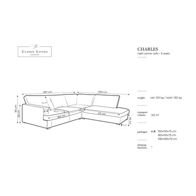 Su kairiuoju kampu, juodos spalvos, keturvietė, plotis 287 cm, gylis 250 cm, sėdynės gylis 66 cm