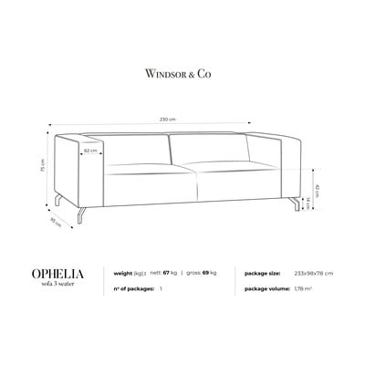 Juodos spalvos, trivietė, plotis 230 cm, gylis 95 cm, sėdynės gylis 59 cm