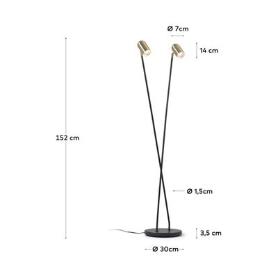 Kave Home grindų šviestuvas Clemence žavi elegantišku juodo metalo konstrukcijos ir dviejų žalvario atspalvių kontrastu. Šviestuvas yra 152 cm aukščio ir turi du šarnyrinius atspalvius, kurie leidžia nukreipti šviesą taip, kaip reikia. Šviestuvas suderinamas su E27 LED lemputėmis, kurių didžiausia galia - 3 W.