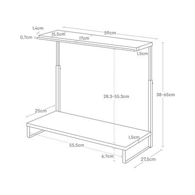 Viršutinėje lentynoje yra griovelis, idealiai tinkantis smulkiems biuro reikmenims laikyti, o erdvė po apatine lentyna suteikia pakankamai vietos patogiai įstumti klaviatūrą. Stovas skirtas 24–27 colių įstrižainės monitoriams.