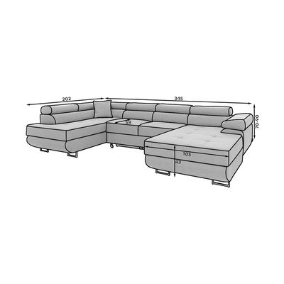 Iš velvetoReguliuojama/sulankstoma/su sandėliavimo vietaSu dešiniuoju kampu/„U“ formosJuodos spalvosKito dydžioPlotis 345 cmGylis 202 cmSėdynės gylis 58 cm