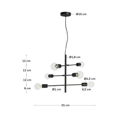 Kave Home juodas 55 cm skersmens pakabinamas šviestuvas "Spica" žavi moderniu dizainu, kuris dominuos jūsų svetainėje. Šviestuvas pagamintas iš metalo, o jo unikalus stilius leidžia išsiskirti šešioms lemputėms ir tapti neatsiejama bendro dizaino dalimi.