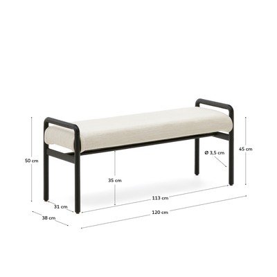 Iš šenilinio audinioMedžio masyvo/paminkštinto audinioJuodos spalvos/kreminės spalvosPlotis 120 cmGylis 38 cmAukštis 50 cm