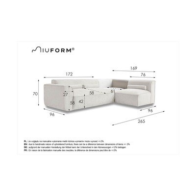 Su dešiniuoju kampu/„L“ formos, šviesiai pilkos spalvos, keturvietė, plotis 265 cm, gylis 169 cm, sėdynės gylis 58 cm