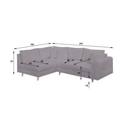 Iš boucle, su kairiuoju kampu/„L“ formos, pilkos spalvos, trivietė, plotis 231 cm, gylis 161 cm, sėdynės gylis 58 cm