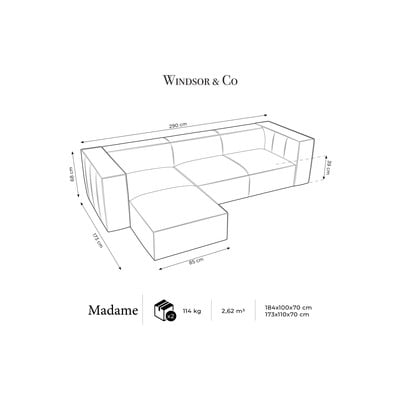 Kampinė sofa MadameIš odos, su kairiuoju kampu/su gultu, atsparus vandeniui, konjako rudos spalvos, keturvietė, plotis 290 cm, gylis 173 cm, sėdynės gylis 60 cm