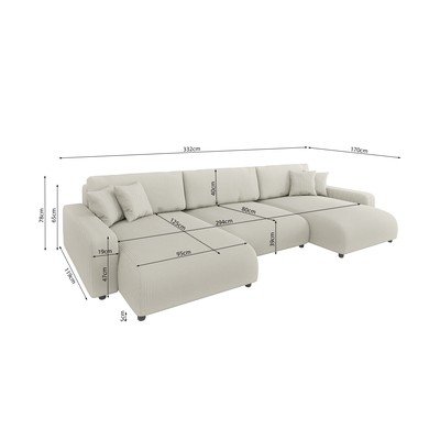 Kampinė sofa SaraIš kordinio velveto, sulankstoma/su sandėliavimo vieta, „U“ formos, kreminės spalvos, kito dydžio, plotis 332 cm, gylis 170 cm, sėdynės gylis 80 cm