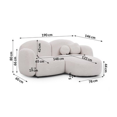 Iš boucleSu dešiniuoju kampu/su gultuAtsparus vandeniui/atsparus dėmėmsKreminės spalvosDvivietėPlotis 190 cmGylis 146 cmSėdynės gylis 65 cm