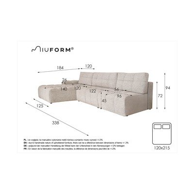 Sulankstoma/su sandėliavimo vietaSu kairiuoju kampuKreminės spalvosTrivietėPlotis 338 cmGylis 184 cmSėdynės gylis 56 cm
