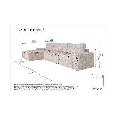 Sulankstoma/su sandėliavimo vietaSu kairiuoju kampuKreminės spalvosKito dydžioPlotis 364 cmGylis 184 cmSėdynės gylis 56 cm