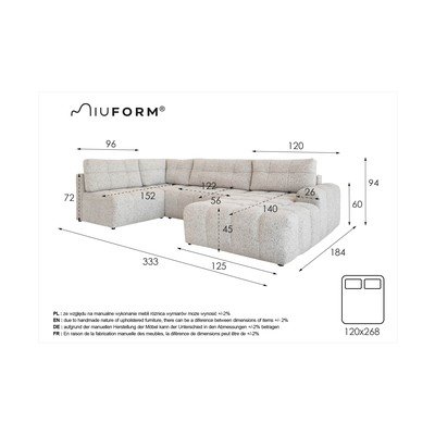 Sulankstoma/su sandėliavimo vietaSu kairiuoju kampuKreminės spalvosKito dydžioPlotis 333 cmGylis 187 cmSėdynės gylis 56 cm