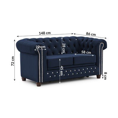 Iš velvetoSulankstomaChesterfield tipoAtsparus vandeniui/atsparus dėmėmsMėlynos spalvosDvivietėPlotis 148 cmGylis 86 cmSėdynės gylis 58 cm
