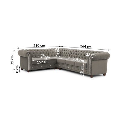 Iš velvetoSulankstomaChesterfield tipoSu kairiuoju kampu/„L“ formosAtsparus vandeniui/atsparus dėmėmsPilkos spalvosKeturvietėPlotis 264 cmGylis 210 cmSėdynės gylis 58 cm