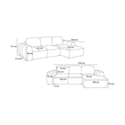 Iš boucle, sulankstoma/su sandėliavimo vieta, su dešiniuoju kampu/su gultu, pilkos spalvos, trivietė, plotis 276 cm