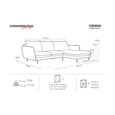 Tamsiai pilkos spalvos kampinė sofa Cosmopolitan Design Vienna, kampas dešinėje